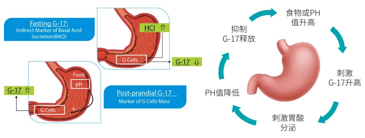 G-17與胃酸形成負反饋機制,胃竇功能正常時該機制可維持胃酸分泌的動態(tài)平衡;當胃竇萎縮時,該機制失衡。